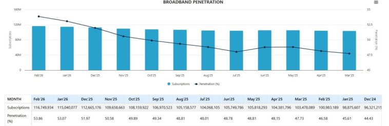 Les statistiques récentes de l’industrie révèlent que les abonnements au haut débit ont atteint 116,7 millions au cours de cette période. Cette progression reflète une croissance soutenue de l’adoption d’Internet, stimulée par l’expansion massive des réseaux mobiles et une demande croissante pour les services de données à travers le pays.