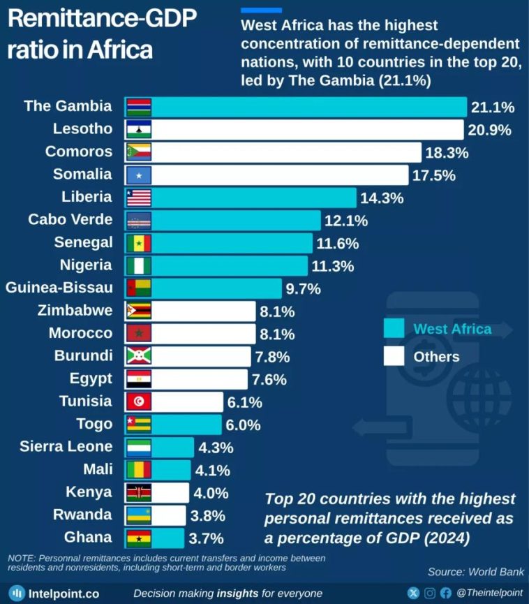 Selon Intelpoint.co la Gambie dépend des transferts de fonds pour plus de 21 % de son PIB. Le Lesotho et les Comores figurent également en tête de liste, les transferts de fonds représentant environ 20 % de leur économie. Ces pays affichent l’un des ratios transferts de fonds/PIB les plus élevés au monde.